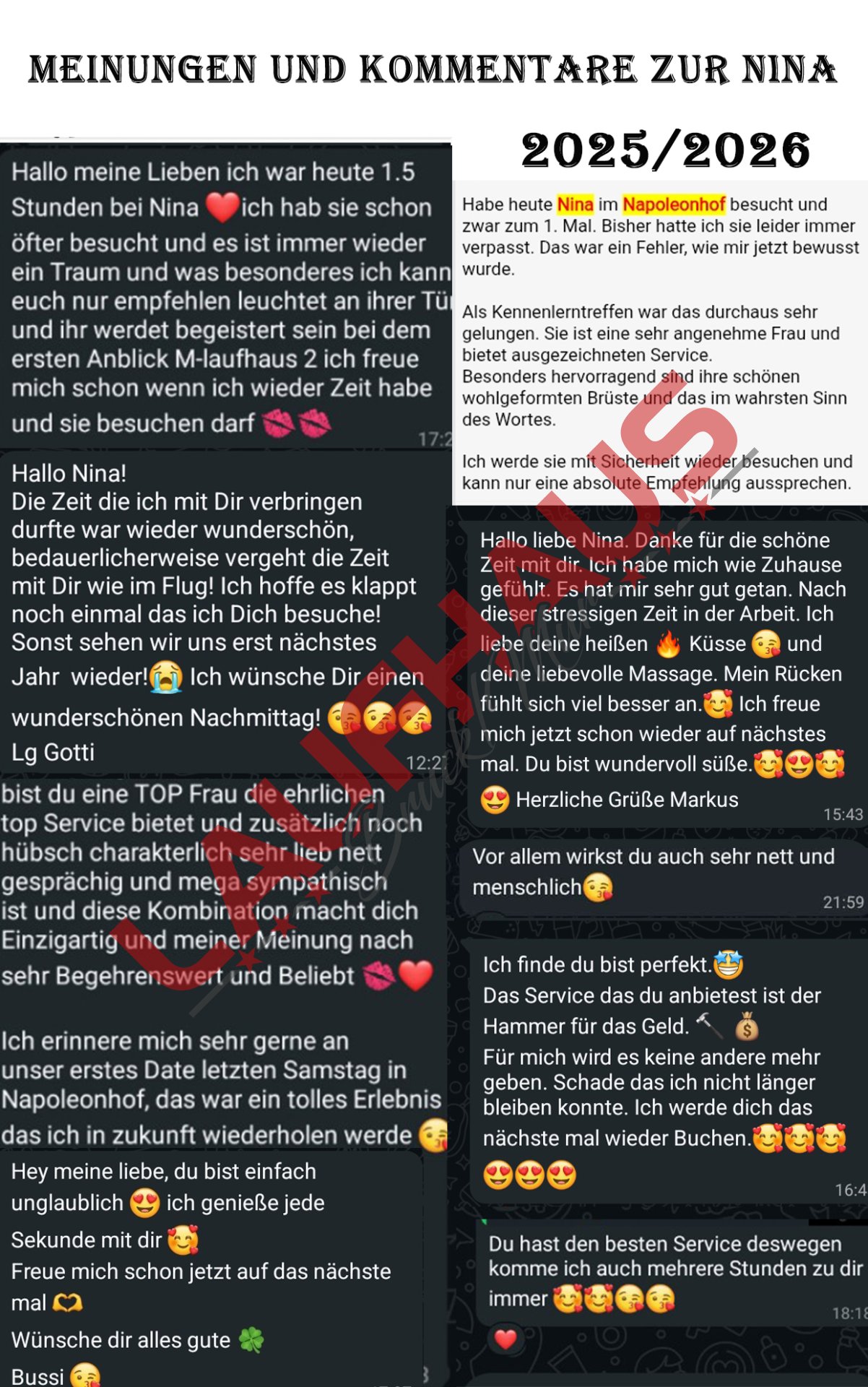 Da die Services der Damen unterschiedlich sind, diese bitte mit der Dame ihrer Wahl absprechen.